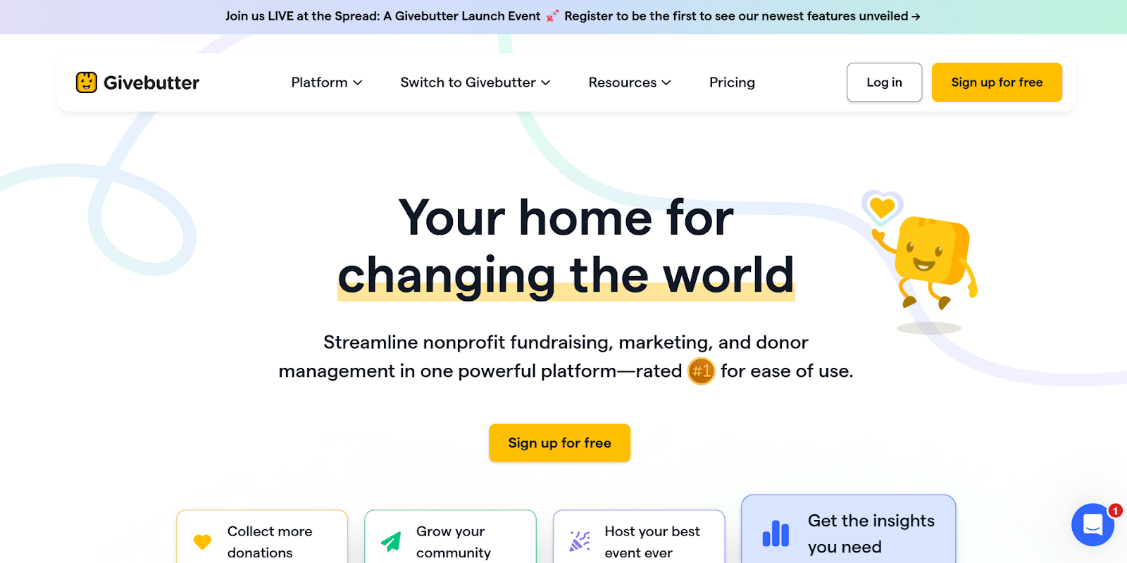 Givebutter provides donor management, donation forms, basic events, fundraising pages, and a built-in CRM in a single platform, along with a mobile app.