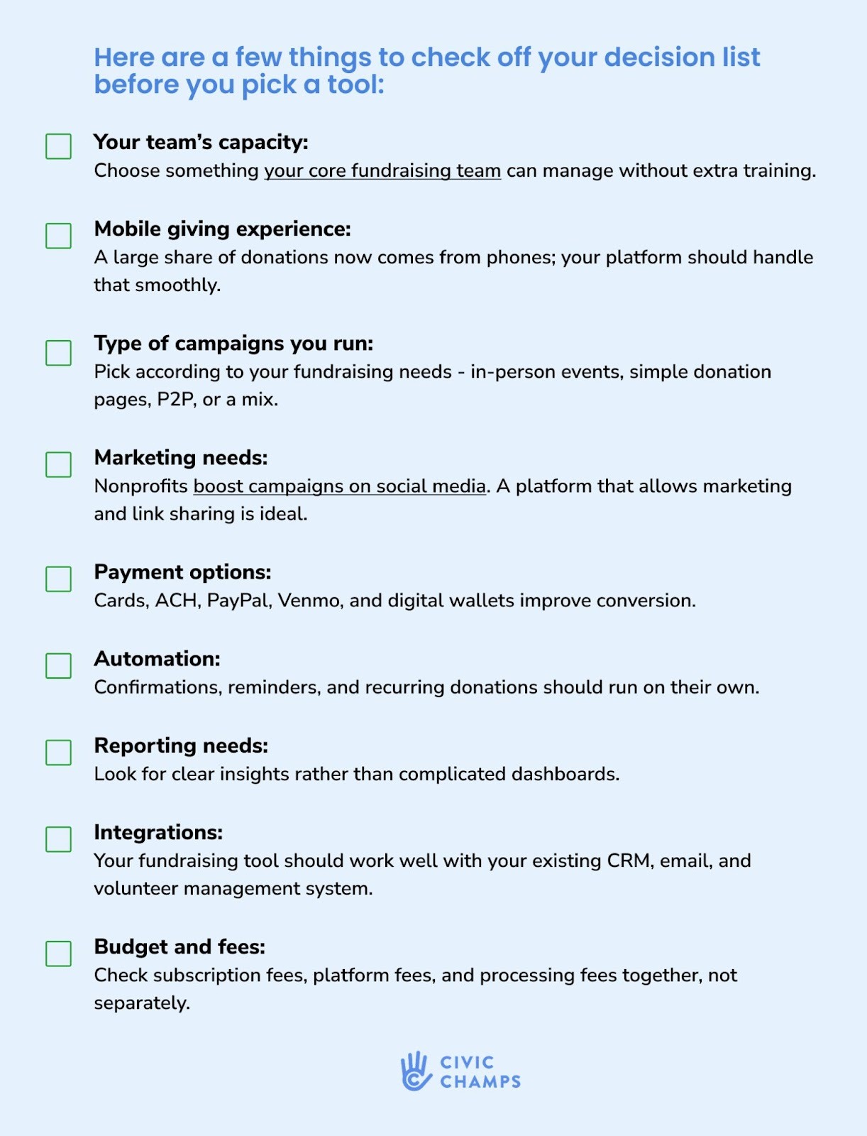 Choosing a fundraising tool becomes a lot easier when you match the platform to the way your team works. Instead of focusing on long feature lists, start with what will reduce your workload, fit your campaign style, and stay realistic for your budget.